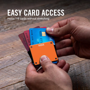 This ultra-minimal carrier holds 1-8 cards and requires less pocket space than a zippo lighter.
